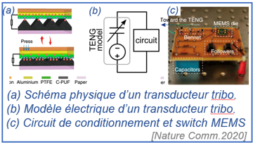 Énergie Mécanique : Transducteurs électrostatiques MEMS et triboélectriques, circuits de conditionnement, calcul adiabatique (basse énergie) par structures MEMS.